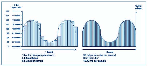 La velocidad de actualización de la salida en un DAC también es importante. Cuanto mayor sea la frecuencia de actualización, más fiel será la señal generada respecto a la original. Sin embargo, esto incrementa la complejidad del sistema.
