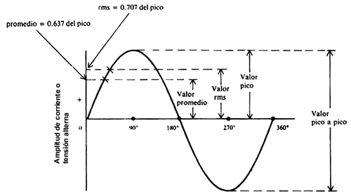 Un ciclo consta de una alternancia positiva (primeros 180°) y una alternancia negativa (segundos 180°) (One cycle consists of a positive half-cycle followed by a negative half-cycle).