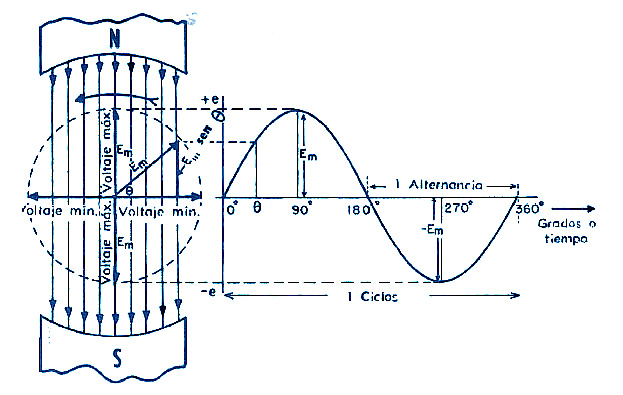 En un generador de corriente alternada con dos polos magnéticos, el voltaje de salida y la corriente completan un ciclo sinusoidal durante una revolución mecánica de la armadura (In an AC generator with two magnetic poles, the output voltage and current complete one sinusoidal cycle per mechanical revolution of the armature).