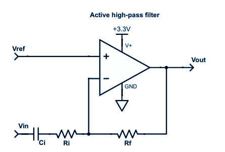 Un filtro pasa-altos activo (active high-pass filter) puede implementarse utilizando un amplificador inversor con una red RC en la entrada. Su funcionamiento es similar al del filtro pasa-bajos, pero permite el paso de señales de alta frecuencia y atenúa las bajas frecuencias.