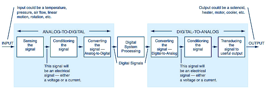 Fig. : Un sistema típico que describe las funciones en la cadena de conversión analógico-digital y digital-analógica.