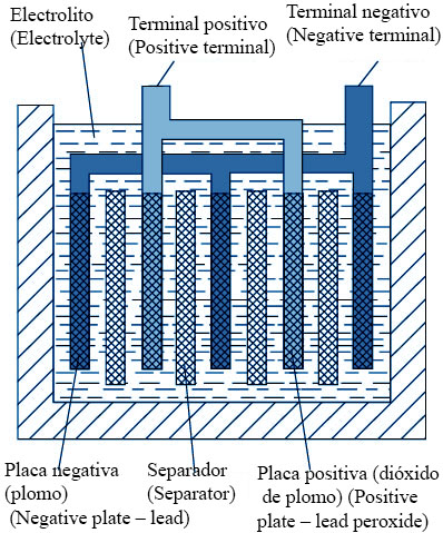 Una batería convencional está compuesta por una carcasa que contiene varias celdas. Cada celda posee placas positivas de dióxido de plomo y placas negativas de plomo esponjoso, separadas por separadores aislantes e inmersas en un electrolito formado por una solución de ácido sulfúrico y agua destilada. La reacción química entre las placas y el electrolito permite almacenar y liberar energía. Al conectarse varias celdas en serie se obtiene la tensión total de la batería.