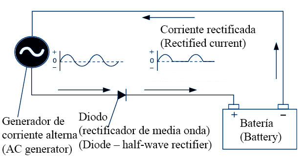 El rectificador tiene como misión principal convertir la corriente alterna generada por el alternador en corriente continua, necesaria para cargar la batería y alimentar los circuitos eléctricos. Está constituido por diodos, dispositivos semiconductores que permiten el paso de corriente en un solo sentido. Gracias a esta propiedad, el rectificador bloquea una parte de la onda alterna y deja pasar la otra, transformando así la CA en CC. En su forma más simple, un rectificador de media onda utiliza un solo diodo y solo aprovecha la mitad del ciclo de la señal.