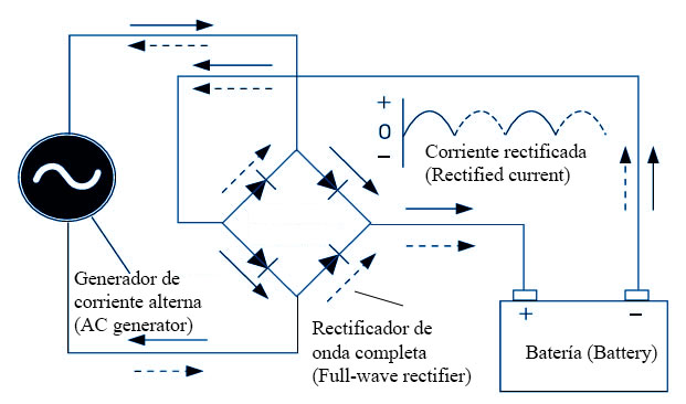 Para mejorar el rendimiento, se utilizan sistemas de rectificación de onda completa, formados por cuatro diodos conectados en puente. En este caso, tanto la mitad positiva como la negativa de la señal alterna son invertidas adecuadamente, de modo que ambas contribuyen a la corriente continua de salida. Esto produce una tensión más uniforme, mayor eficiencia y mejor capacidad de carga de la batería.