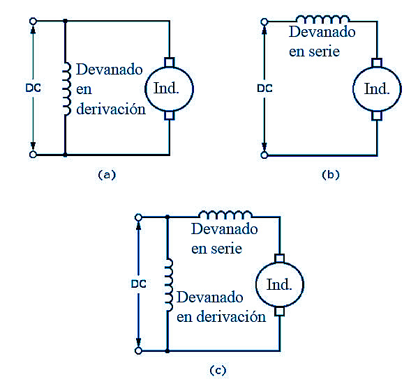 Fig. : Diagramas esquemáticos de tres motores DC comunes: (a) motor en derivación; (b) motor en serie; (c) motor compuesto.