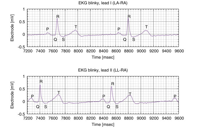 Figura : Un registro de EKG del latido cardíaco de Kevin Karplus. A pesar de utilizar las mismas escalas de tiempo, estas trazas fueron registradas en diferentes momentos y corresponden a distintos latidos.