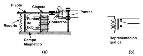 Fig. 1 - Sección transversal de (a) un relé electromagnético y (b) diagrama esquemático del relé.