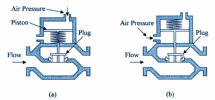 Figura : Válvulas neumáticas o hidráulicas a prueba de fallos: ante la pérdida de presión de operación en la válvula, la válvula en (a) se abrirá y la válvula en (b) se cerrará.
