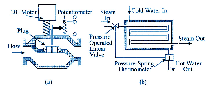 En la Figura (b) se presenta un sistema neumático autorregulado para el control de temperatura en un intercambiador de calor. Un termómetro de resorte y presión mide la temperatura del agua caliente de salida y convierte esa variable en una señal de presión que acciona una válvula lineal en la línea de vapor. Si la temperatura aumenta, la válvula se cierra parcialmente; si disminuye, se abre. De este modo, el sistema mantiene automáticamente la temperatura en el valor establecido mediante un equilibrio dinámico entre presión, flujo y calor transferido.