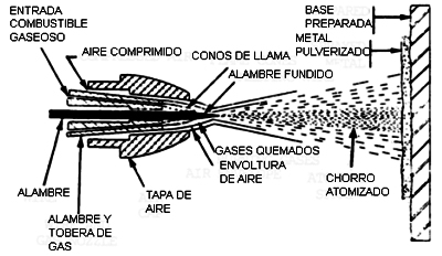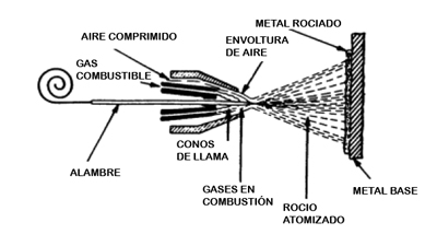 Metalizado (térmico) por llama: es precisamente lo que muestra el gráfico. También se le llama “flame spray” o “proyección por llama”: el alambre se funde en la llama y las gotas se atomizan con aire comprimido para proyectarse sobre la pieza.