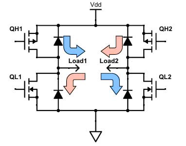 Si se activan QH1 y QL2, entonces la corriente fluye desde Load1 hacia Load2 (flechas azules). Si se activan QH2 y QL1, la corriente fluye en sentido contrario, desde Load2 hacia Load1 (flechas naranjas).