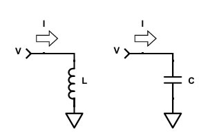Figura . Si utilizamos la misma dirección de flujo de corriente para ambos, inductores (inductors) y capacitores (capacitors), como se muestra aquí, entonces las ecuaciones diferenciales son v = L di/dt e i = C dv/dt. Una tensión positiva provoca que la corriente a través del inductor aumente, y una corriente positiva provoca que la tensión en el capacitor aumente.