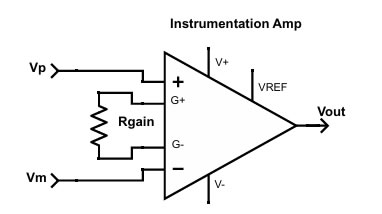 Figura : El símbolo esquemático estándar de un amplificador de instrumentación tiene dos entradas a la izquierda, rodeando un par adicional de conexiones que se utilizan para una resistencia externa que controla la ganancia. La entrada Vref aparece en la parte superior o inferior del símbolo, de modo que se trata como una entrada de alimentación. Los nombres de entrada Vp y Vm utilizados en este libro se seleccionan en función de los símbolos “+” y “−” del triángulo del amplificador.