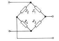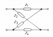 | Lattice network, red en celosía (Electrónica - Electronics), Una red de dos pares de terminales consistente en dos elementos en serie, uno en cada rama, y dos elementos en paralelo, puenteando cada uno de ellos la entrada de una rama con la salida de la otra . La red en celosía se muestra en su forma habitual en la figura siguiente,