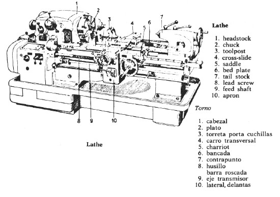Aunque simple y versátil, un torno mecánico requiere un maquinista experto, porque todos los controles se manipulan en forma manual. Por lo tanto, es poco eficaz en operaciones repetitivas y líneas de producción grandes. Torno, torno mecánico. ( Ingeniería mecánica ) ; apron lathe, torno de escudo; automatic lathe, torno automático; axle lathe, torno de mecanizar los ejes; axle turning lathe, torno para espigas de ejes; back centre of a lathe, contrapunta de un torno; bar lathe, torno al aire, torno de barra, torno de varal; bar of gantry lathe, torno de bancada prismática; bench lathe, torno para banco; boring lathe, torno de escariar; brass finisher‘s lathe, torno de filetear; break lathe, torno de hancada partida; camshaft lathe, torno para árbol de levas; capstan lathe, torno de revólver; centering lathe, torno de puntas; centre lathe, torno de puntas, torno ordinario, torno paralelo; chasing lathe, torno de embutir; chuck or chuck plate lathe, torno al aire; chucking lathe, torno de mandril; combination turret lathe, torno de combinación, torno de torreta; contour turning lathe, torno de copiar; copying lathe, torno de copiar, torno de reproducir (See: Copying); core lathe, torno para machos; crankshaft lathe, torno para cigüeñales; cutting off lathe, torno de recortar; double centre lathe, torno de dos puntas; drilling lathe, máquina horizontal de escariar, máquina horizontal de perforar; duplex lathe, torno de doble herramienta; engine lathe, torno de cilindrar y de filetear, torno paralelo; face lathe, torno al aire; facing lathe, torno al aire, torno de plato de garras; finishing lathe, torno de segunda operación; flywheel lathe, torno de plato; forming lathe, torno de perfilar, torno de reproducir; founder‘s lathe, torno de calibre, torno de machos; frame of lathe, bastidor de torno; gap lathe, torno de bancada rota; glass-maker‘s lathe, torno de vidriero; grinding lathe, torno de damasquinar, torno de pulir; hand lathe, torno a mano; hand tool lathe, torno de herramienta de mano; head of lathe, cabezal motor de torno; high power lath, torno de gran potencia; high speed lathe, torno de gran velocidad; manufacturing lathe, torno de fabricación; monitor lathe, torno de revólver; motor driven headstock lathe, torno de cabezal motor; multicut lathe, torno de herramientas múltiples; non screw cutting lathe, torno de cilindrar; operation lathe, torno de operación; parallel lathe, torno paralelo; precision lathe, torno de precisión; production lathe, torno de producción; regulator screw of the slide of a lathe, tornillo regulador de un carro de torno; relieving lathe, torno de destalonar, torno de retornear; roll turning lathe, torno de tornear los cilindros de laminador; roughing lathe, torno de desbastar redondos; screw cutting lathe, torno de filetear, torno de roscar; second operation lathe, torno de segunda operación; semi-automatic lathe, torno semiautomático; shafting lathe, torno para árboles de transmisión; short bed lathe, torno de bancada corto; side of a lathe, jimelga de un banco de torno; single pulley lathe, torno monopolea; slicing lathe, torno de tronzar; slide or sliding lathe, torno de cilindrar, torno paralelo; sliding and screw cutting lathe, torno de cilindrar y de filetear; sliding and surfacing lathe, torno de cilindrar y de pulir; spindle lathe, broca de torno; spinning lathe, torno de embutir, torno de repujar; stud lathe, torno para pernos; surface lathe, torno al aire, torno de plato; surfacing lathe, torno de pulir superficialmente; tailstock of a lathe, cabezal móvil; threading or thread cutting lathe, torno de filetear; throw lathe, torno de mano; tool maker lathe, torno de herramentista, tool room lathe, torno de utillaje; trunnioning lathe, torno de tornear los muñones; turning lathe, torno de cilindrar; turret lathe, torno de revólver, torno de torreta; turret lathe with capstan, torno de torreta; tyre lathe, torno para llantas de ruedas; universal lathe, torno universal; 5 in-center, torno de cinco pulgadas de altura de punta; to put the work in the lathe, montar la pieza en el torno.
