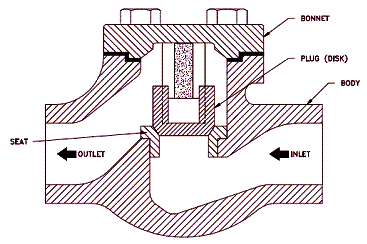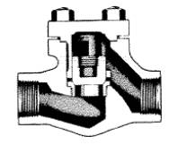 The seats of metallic body lift check valves are either integral with the body or contain renewable seat rings. Disk construction is similar to the disk construction of globe valves with either metal or composition disks. Fig.: Lift Check Valve - Válvula horizontal de retención Válvulas horizontales de retención: Una válvula horizontal de retención ( también válvula de retención y antirretorno), ilustrada en la figura arriba, es comúnmente usada en sistemas de cañerías en los cuales se usan válvulas globo como válvulas de control de fluido . Estas tienen disposiciones de asiento similares a las válvulas globo.