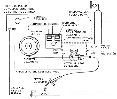 El sistema de soldadura MIG/GMAW consta de los siguientes elementos: