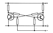 | Multivibrator, multivibrador (Electrónica - Electronics ), Un circuito constituido por dos circuitos activos, estando la salida de cada uno de ellos acoplada con la entrada del otro. Como consecuencia del alto grado de realimentación positiva así generado, el circuito sólo presenta dos estados estables. Si ambos dispositivos activos son tubos electrónicos o transistores del mismo tipo, entonces en uno de los estados uno está al corte y el otro está saturado, y en el otro estado ocurre al revés. Si se utilizan transistores complementarios, ambos se encuentran al mismo tiempo al corte en un estado y saturados en el otro. Si el acoplo entre dispositivos es directo, como en la figura siguiente, ambos estados son estables y el circuito se denomina biestable.