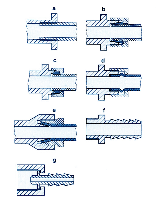 b) Compression fitting in which the ferrule bites into the tube material, forming a joint that can be disassembled.