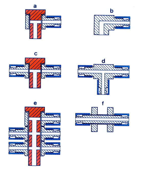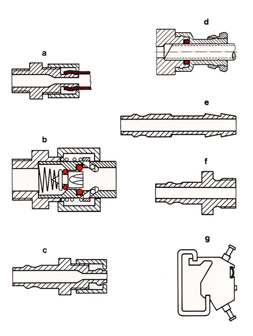 b) Enchufe rápido para tuberías con las piezas de unión c, d y f. (Quick connector for tubing with the connection parts c, d and f.)