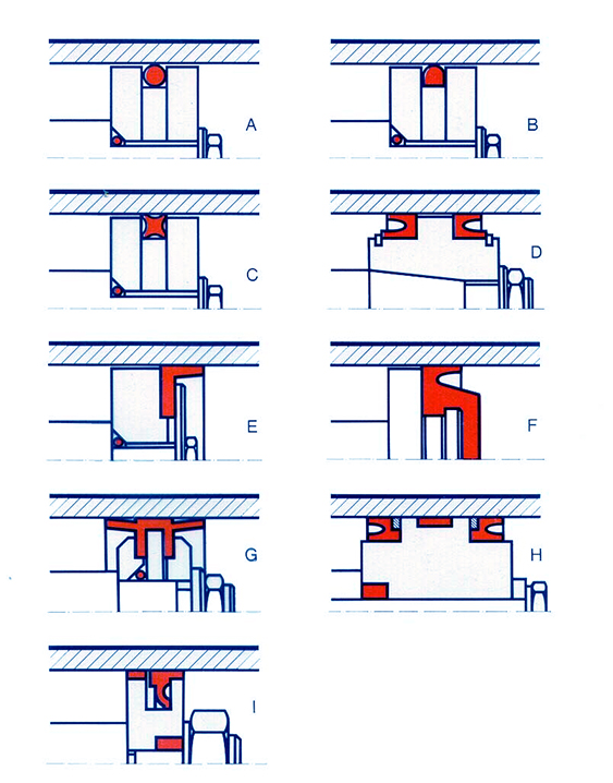 (C) Quadrangular seal (Quad ring): small installation dimensions and precise fit, two sealing lines, limited adjustment, suitable for small diameters.)