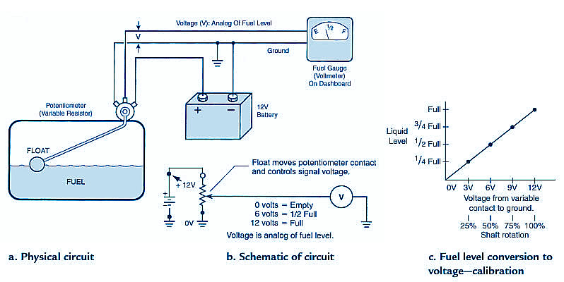 La figura asociada muestra tres aspectos del sistema. En la parte a, se observa el circuito físico (physical circuit), con el tanque, el flotante y el mecanismo unido al potenciómetro. En la parte b, se presenta el esquema del circuito (schematic of circuit), donde se aprecia cómo el potenciómetro está conectado a la fuente de alimentación y cómo el contacto móvil controla la tensión de salida. En la parte c, se muestra la calibración del nivel de combustible en función de la tensión, es decir, la relación entre la posición del eje, la fracción del tanque y el voltaje disponible en la salida.