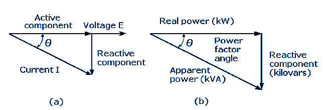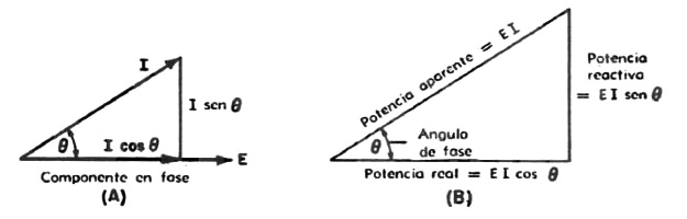 Fig. : Diagramas vectoriales de los componentes activos y reactivos en un circuito de corriente alterna: (a) tensión y corriente; (b) potencia real y potencia aparente.