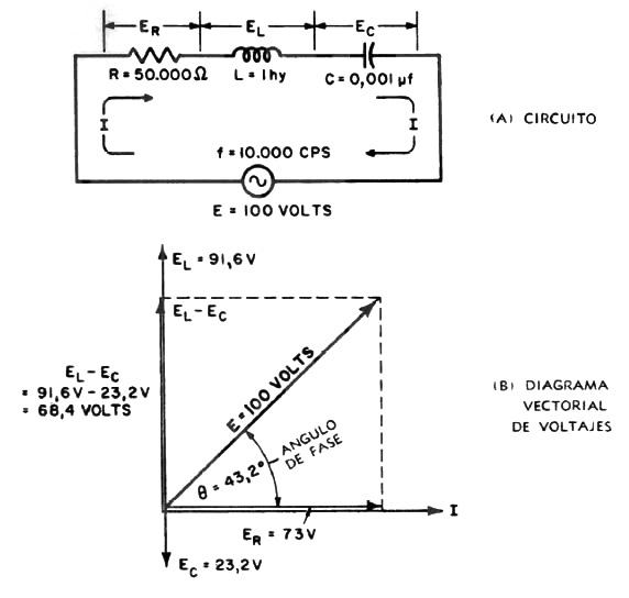 Una resistencia de 50 kΩ, una bobina de 1 H y un condensador de 0,001 μF están conectados en serie a 100 V y 10 kHz.