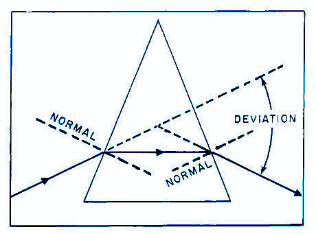 Cuando un rayo de luz atraviesa un prisma, se refracta hacia la normal (normal) en la primera superficie y se aleja de ella en la segunda. El ángulo de desviación representa el cambio total en la dirección del rayo. Este principio es esencial en dispositivos ópticos como binoculares, periscopios y sistemas de medición. |