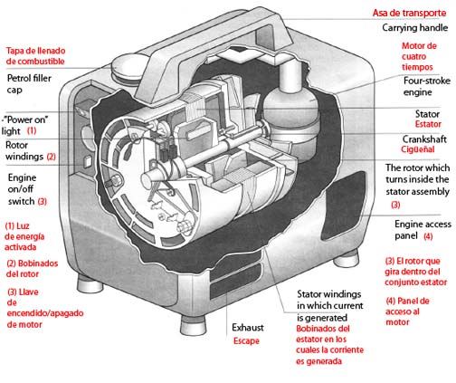 Los generadores portátiles son hechos de dos partes principales: un motor, que impulsa el equipo, y un alternador, que convierte movimiento en electricidad .