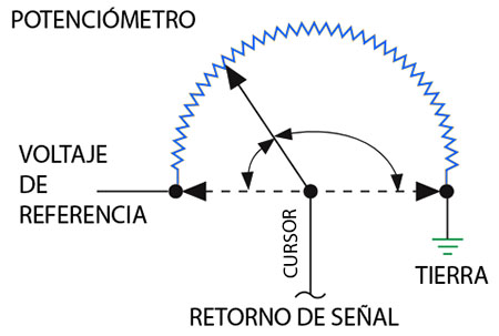 voltage from the wiper - Se utiliza un potenciómetro para enviar una señal de voltaje desde el cursor.