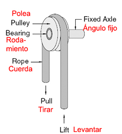 La polea es una variación de la rueda. La polea es una rueda con una ranura circular, que proporciona una guía para una cuerda desplegada sobre el diámetro exterior. Si un extremo de la cuerda se tira con 1 libra de fuerza, entonces el otro extremo genera 1 libra de elevación.