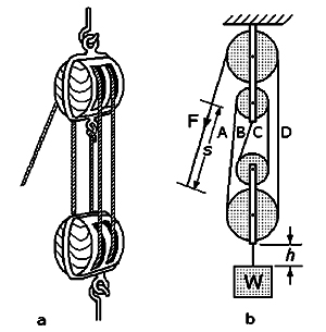 La figura b muestra las poleas separadas para mayor claridad . Para elevar la carga hasta una altura h, cada una de las secciones del cable A, B, C y D deben moverse a una distancia igual a h . El operador u otra fuente de potencia deben ejercer una fuerza F a lo largo de una distancia s = 4h para que la relación de velocidad de s sobre h sea 4. Por lo tanto, la ventaja mecánica teórica del sistema mostrado es 4, correspondiente a los cuatro cables que soportan la carga W. La ventaja mecánica teórica TA para cualquier sistema de polea similar a la mostrada es igual a la cantidad de cables paralelos que soportan la carga . |