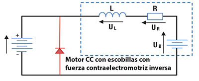 Fig. : Circuito equivalente básico para motor de corriente continua con escobillas. Cuando el motor está funcionando a velocidad moderada, se puede representar mediante un inductor, una resistencia y una fuente de alimentación.