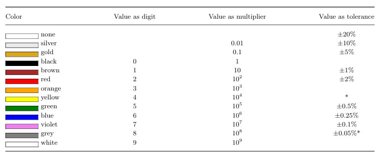 (*) En resistores de alto voltaje, el amarillo y el gris reemplazan al oro y la plata para tolerancias de ±5% y ±10%, con el fin de evitar partículas metálicas en la superficie del resistor que puedan provocar arcos eléctricos. |