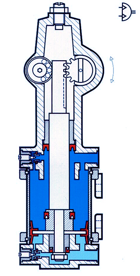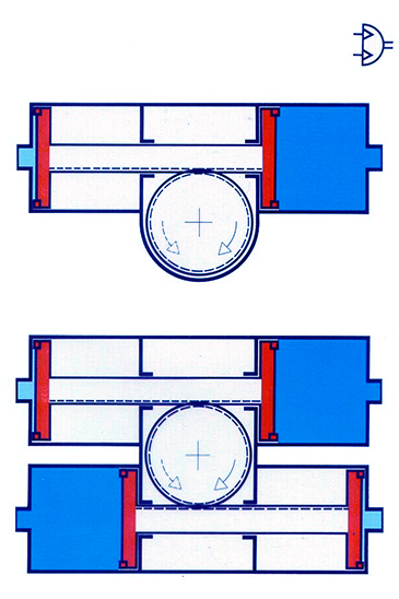 Los émbolos de los cilindros están unidos por una cremallera común. Una rueda dentada engrana en ambas cremalleras.
