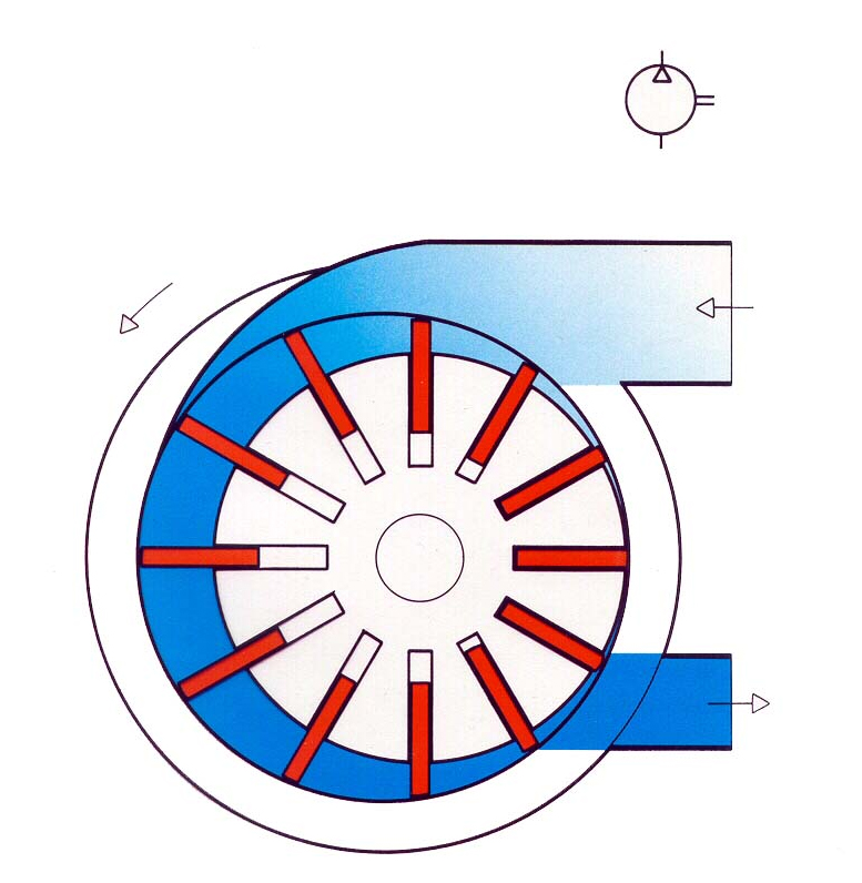 Un rotor excéntrico, dotado de paletas gira en un alojamiento cilíndrico. La estanqueidad en rotación se asegura por la fuerza centrífuga que comprime las paletas sobre la pared.
