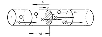 Bajo la influencia del campo eléctrico , los electrones libres de un hilo metálico experimentan una fuerza de sentido opuesto al del campo, y son acelerados en el sentido de esta fuerza . ( Los otros electrones y los núcleos positivos son también accionados por el campo, pero no son acelerados, por impedirlo las fuerzas de ligadura que mantienen estos electrones unidos al núcleo y los núcleos unidos entre sí formando un sólido) . Los choques con las partículas que quedan fijas en el metal, frenan pronto a los electrones libres o los detienen, después de lo cual vuelven a ser acelerados, y así sucesivamente. Su movimiento es, por tanto, una sucesión de aceleraciones y frenados, pero adquieren cierta velocidad media en sentido opuesto al campo, y supondremos que se mueven uniformemente con esta velocidad media. Los electrones libres participan también de la energía térmica del conductor, pero su movimiento de agitación térmica es un movimiento al azar y para nuestro propósito presente puede no ser tenido en cuenta.