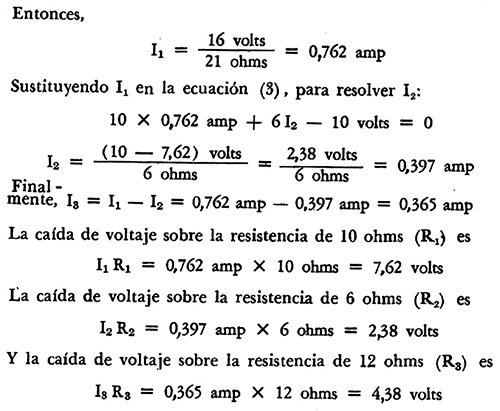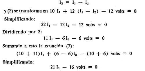 Vemos que tenemos tres ecuaciones simultáneas con tres incógnitas (I1, I2, I3). Resolviendo la ecuación (1) para I3 sustituyendo en la ecuación (2)