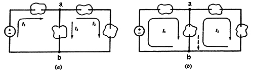 En la figura 1(b) las corrientes en malla I1 e I2 están asignadas a la misma red de tres ramas.