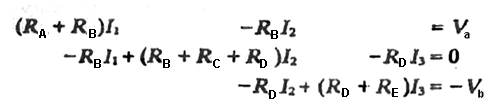 Ahora el elemento R11 (fila1, columna 1) es la suma de todas las resistencias a través de las cuales pasa la corriente I1 de malla. En la figura 4, ésta es Ra + Rb. De manera similar, los elementos R22y R32 son las sumas de todas las resistencias a través de las cuales pasan I2 e I3 respectivamente.