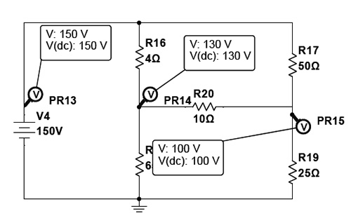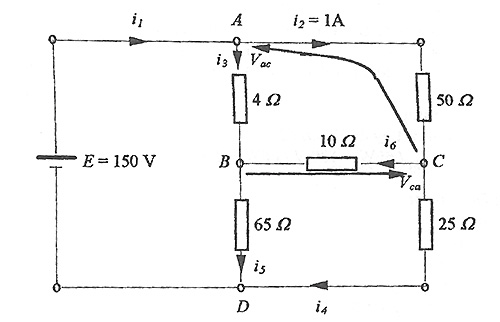 para las corrientes de rama I1, I2, I3, aplicando la ley de Kirchhoff de la corriente a los nodos principales e igualando los voltajes de las ramas paralelas. Así, la ley de Kirchhoff de la corriente en el nodo a da I1 = I2 + I3; y el voltaje Vab puede ser escrito para cada una de las tres ramas, cuando los