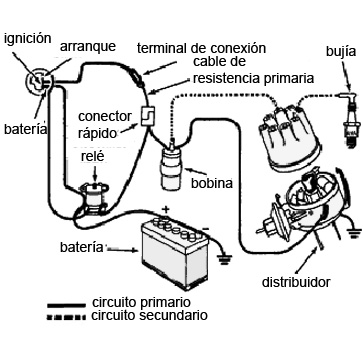 Con los puntos de contacto conectados a los devanados primarios de la bobina de encendido, los puntos de contacto cierran y abren el circuito primario de la bobina de encendido. Con los puntos de contacto cerrados, se forma el campo magnético en la bobina. Al momento en que los puntos se abren, desaparece el campo magnético y el voltaje es enviado a las bujías.
