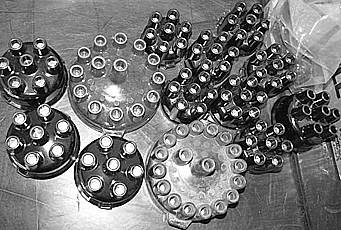 Puntos de contacto: Los puntos de contacto, puntos de ignición o también llamados los platinos, actúan como interruptores eléctricos a resorte en el distribuidor. Su función es la de hacer que el flujo de corriente sea intermitente en el circuito primario, haciendo así que el campo magnético en la bobina aumente y desaparezca cuando el mismo alcanza la fuerza máxima. Los cables del condensador y el circuito de la bobina de encendido primaria se conectan a los puntos.