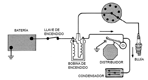 Cuando el campo magnético de la bobina colapsa, o sea desaparece, se produce por inducción una corriente en el devanado primario, así como en el arrollamiento secundario. Dado que toda la corriente del primario debe pasar a través de los puntos de contacto, se necesita algún dispositivo para evitar que la corriente de lugar a la formación de arcos entre los puntos cuando están abiertos. Este dispositivo se llama condensador. Un condensador puede absorber y almacenar corriente eléctrica, ayudando al sistema de encendido de manera más eficiente.