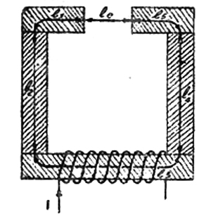 donde es la reluctancia magnética total y las longitudes de cada trozo se toman en centímetros; las secciones transversales en cm2 y las permeabilidades son las correspondientes al valor de la intensidad de campo magnético producido por la bobina.