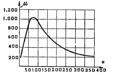 Como sabemos que el cociente entre la inducción y la intensidad de campo da la permeabilidad magnética, se puede hacer ese cociente para cada par de valores y obtener una curva que de los valores de de permeabilidad en función de la intensidad de campo. Es el gráfico de la figura siguiente, en el que se nota que el valor de la permeabilidad crece hasta un máximo para decrecer paulatinamente luego, debido a los efectos de la saturación magnética del núcleo.