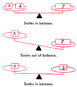 To make the scales come into balance again, how many pounds should be removed from the right side of the scales? The answer, of course, is 4. If 4 lb. are removed from the right side, which originally contained 7 lb., we will have 3 lb. left. Since the scale is now in balance, we have x pounds on the left side balancing 3lb. on the right side.