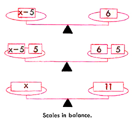 Let us consider the equation x - 5 = 6. The left member of the equation corresponds to the number of units of weight on the left side of the scales, and the right member of the equation corresponds to the number of units of weight on the right side of the scales. If we add 5 units of weight to both the left and right sides of the scales, the scales will remain in balance. This can be compared to the equation x = 11, and thus we have found the value of x in the equation x - 5 = 6. In adding 5