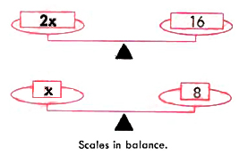 Let us consider the equation 2x = 16. The left member of the equation corresponds to the number of units of weight on the left side of the scales, and the right member of the equation corresponds to the number of units of weight on the right side of the scales. If we remove half of the number of units of weight from each side of the scales, the scales will remain in balance. This can be compared to the equation x = 8, and we have fomid the value of x in the equation 2x = 16. In dividing the weights on each side of the scales by the same number, we have seen that the scales remain in balance. We can apply this same principle to an equation: |